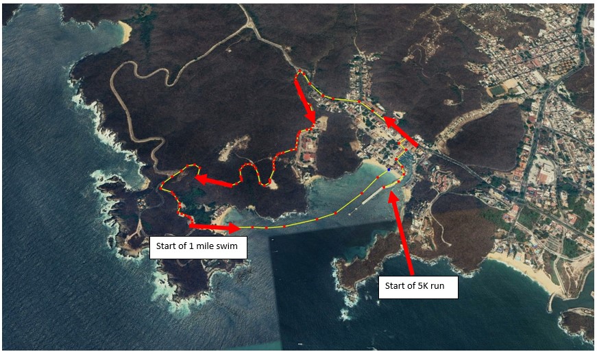 Huatulco, centered on the town of La Crucecita, is a tourist development in Mexico. It is located on the Pacific coast in the state of Oaxaca. Huatulco’s tourism industry is centered on its nine bays, thus the name Bahias de Huatulco, but has since been unofficially shortened to simply Huatulco. What makes it to cool is that the ship docks in a bay where there are several beaches. Although some of these beaches are only 300 yard away from the ship via water, the only way to get there is via a hilly road. We wanted to get a good start of the day and decided to run to this beach, than jump in the water and swim back to the ship. The run is approximately 5k and the swim about 1 mile. We were with 5 crew members and thus I decided to rent a boat, just to make sure there would be help close by, in case needed. Here is an overview of the course and a video of the swim.