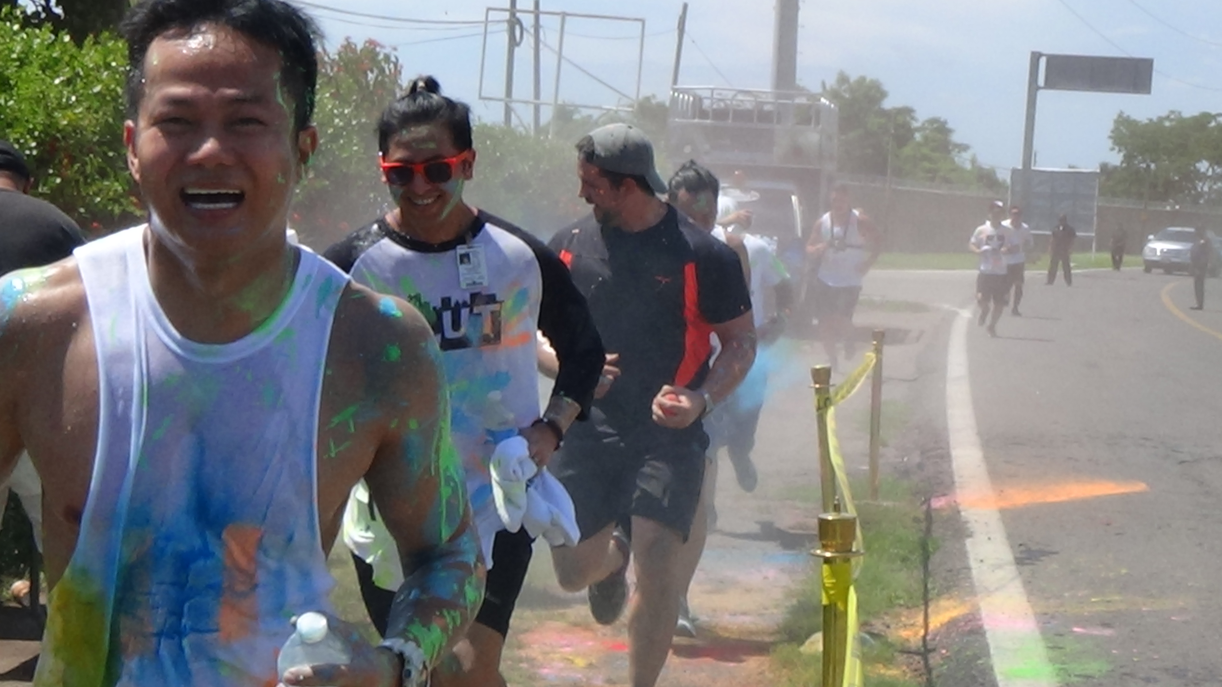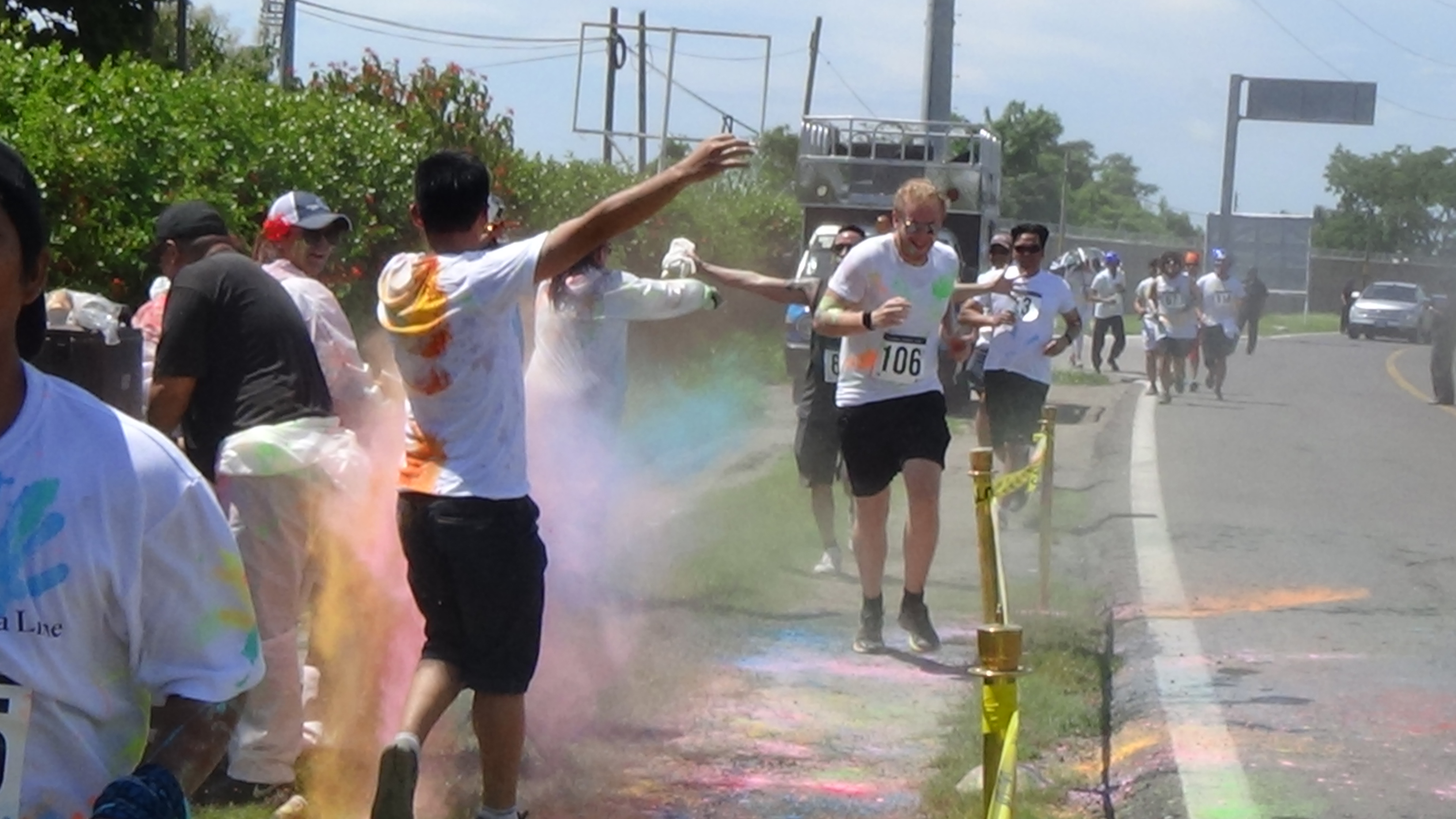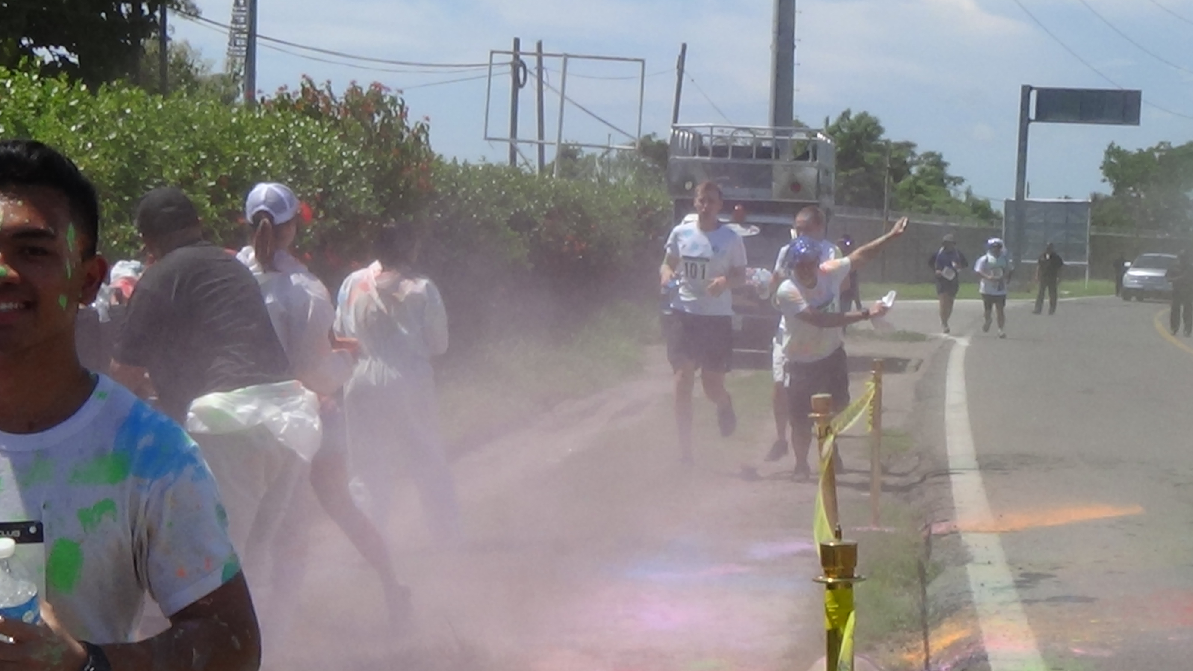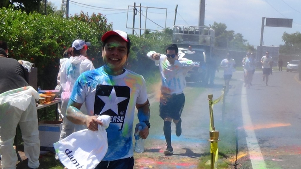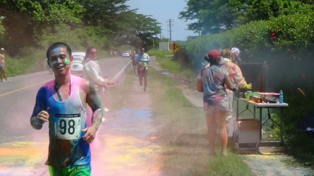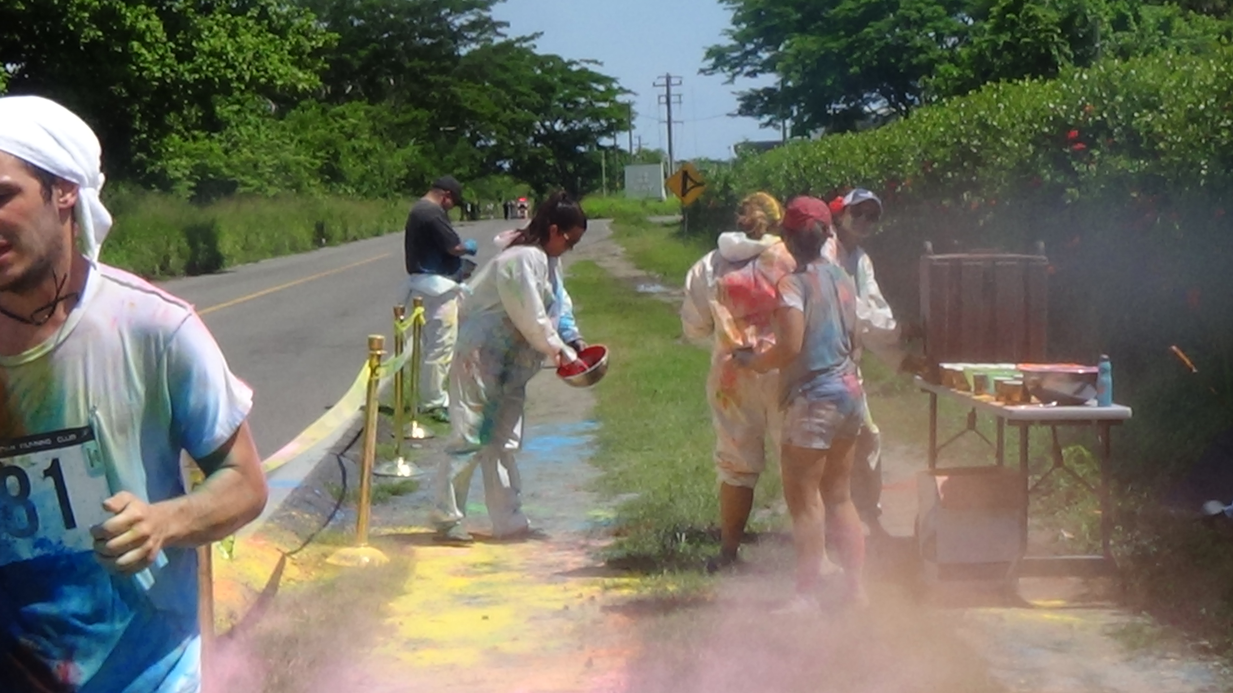 at 10:00 am the crew got underway. The course was 2.5k up and 2.5k down run and with 3 powder stations, the crew went through these stations 6 times….You can imagine the amount of color we went through. I literally had blue and green toes for 2 weeks…..Couldn’t get the stuff off my feet