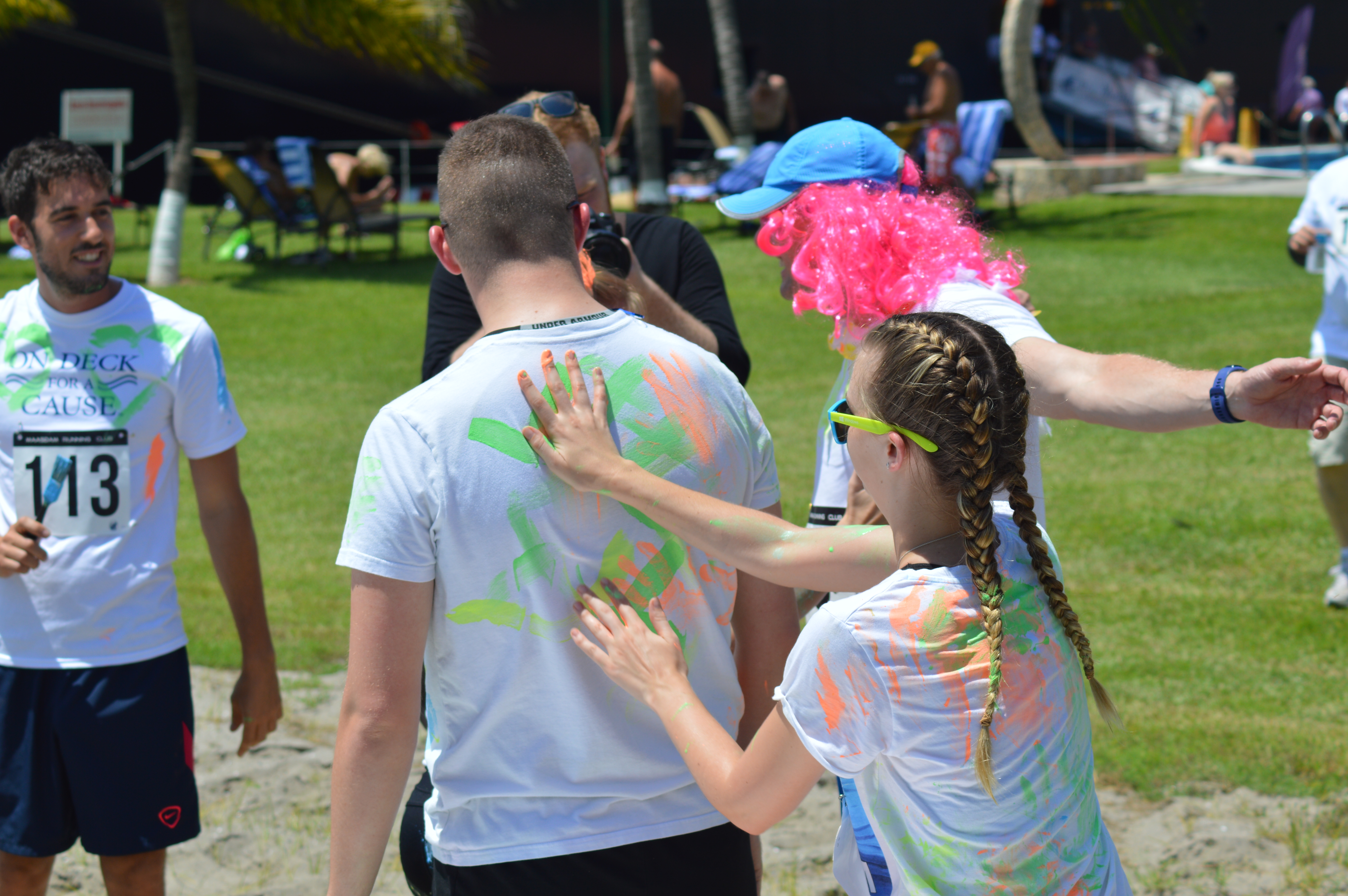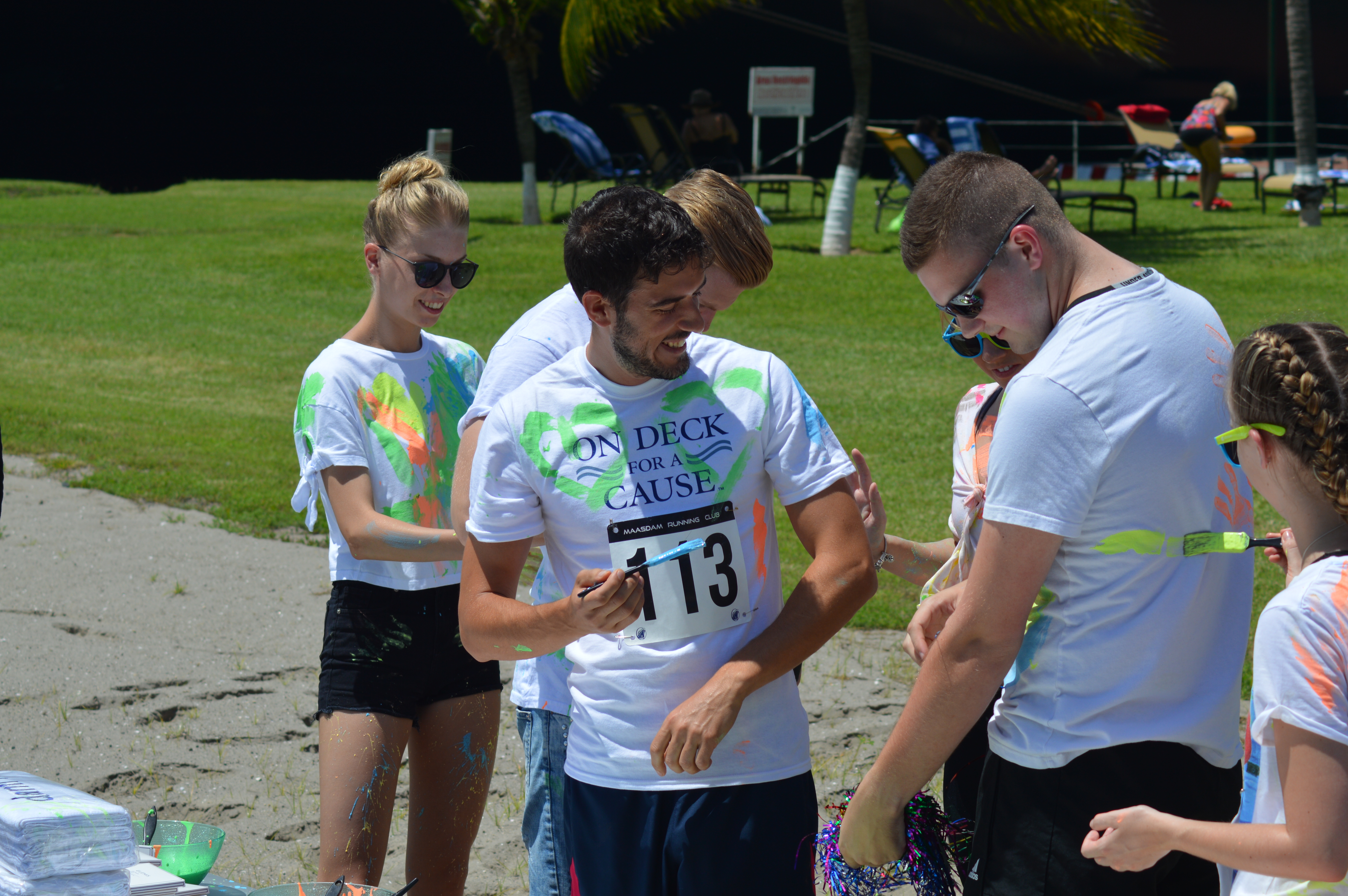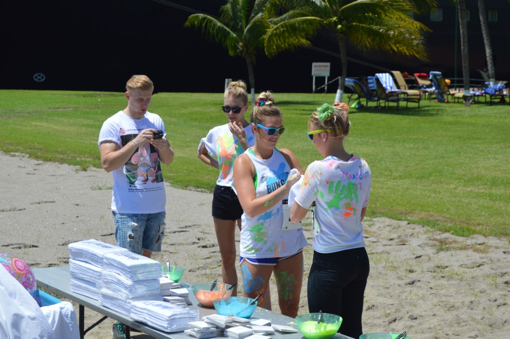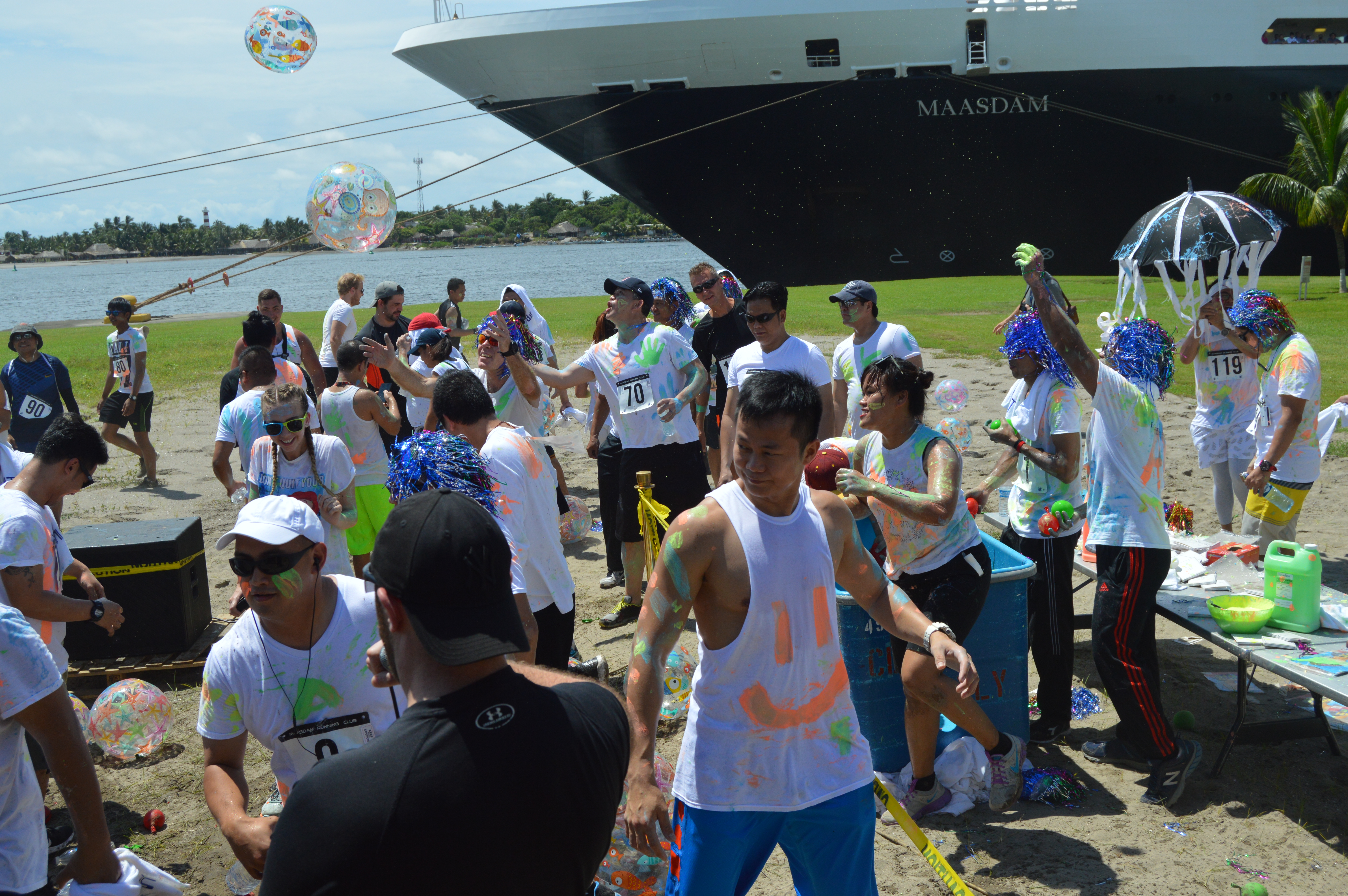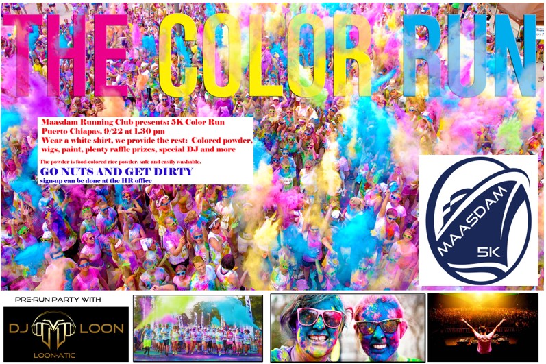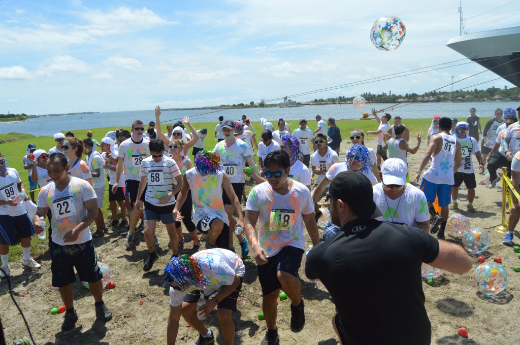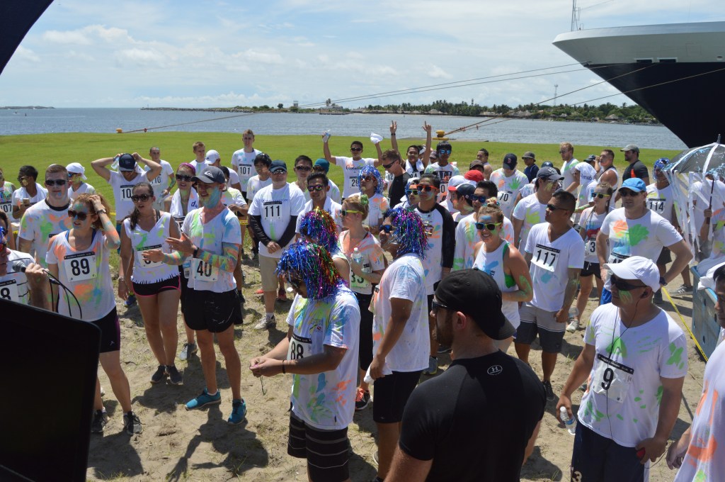 I decided to do something none of the ships had done before: a color run whereby runners get thrown colored powder. This is a phenomenon well known all over the world by runners and now time had come to introduce this to the, mostly, non-runners.