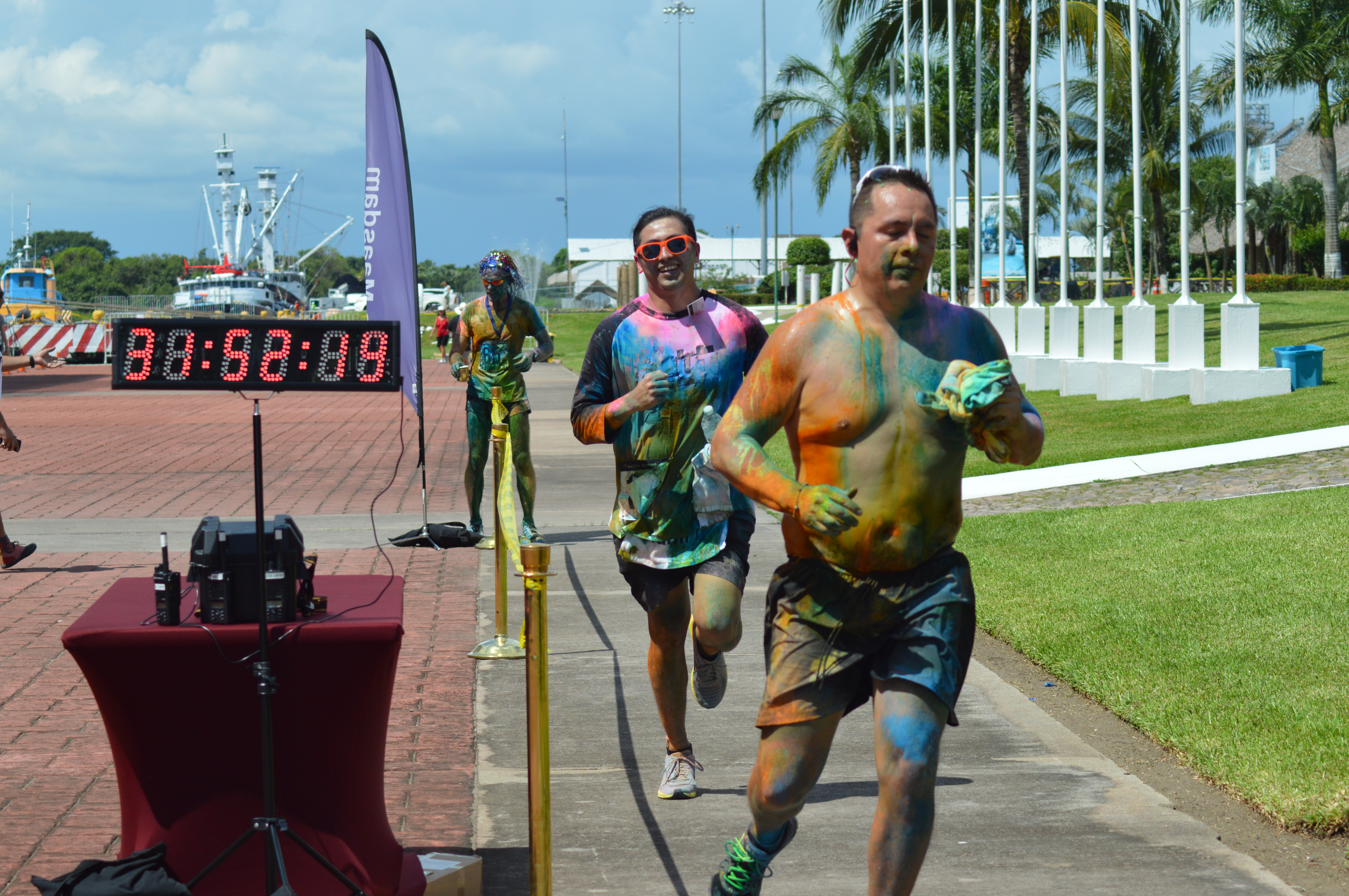 Good thing is that we do the Panama run several times, which gave me the opportunity to explore the options over the next couple of weeks. During our call in Chiapas I invited the mayor, the agent and some other local officials; we had lunch on the ship and I explained what I wanted. All of them were right away enthusiastic and with that in mind, I started to plan and draw out the event. Organizing a 5K run is not that hard however, I wanted to go full on, and that takes a bit of planning to say the least; I had to set out a course, order finish banners, order a timer, medals, colored powder (and how much would I need for say, 300 runners, bib numbers, prizes, beach balls, tape, I had to arrange police cars, camera crew, I had to arrange portable speakers, a DJ, a fitness guy to do a live warm-up for all the runners, a podium, start line, finish line, drone videographer etc. In other words, time to get the ball rolling and the first thing I had to take care of were the bib numbers and the medals and so I designed them and ordered 350, hoping it would be enough. If it would turn out to be too many, I could always use them for a next 5K.