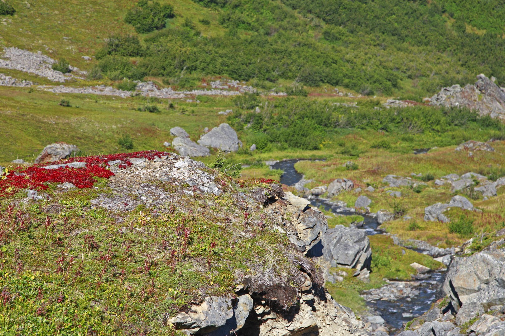 Both bring you to the top, but, as I need to get back to the ship in one piece, I chose for the first option and take the normal trail head. This trail is very scenic and the higher you go, the more meadows you see. Since we are here during the summer months, the meadows are amazing, with bright red flowers and almost fluorescent green grass.
