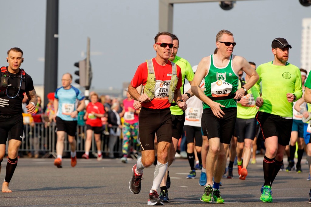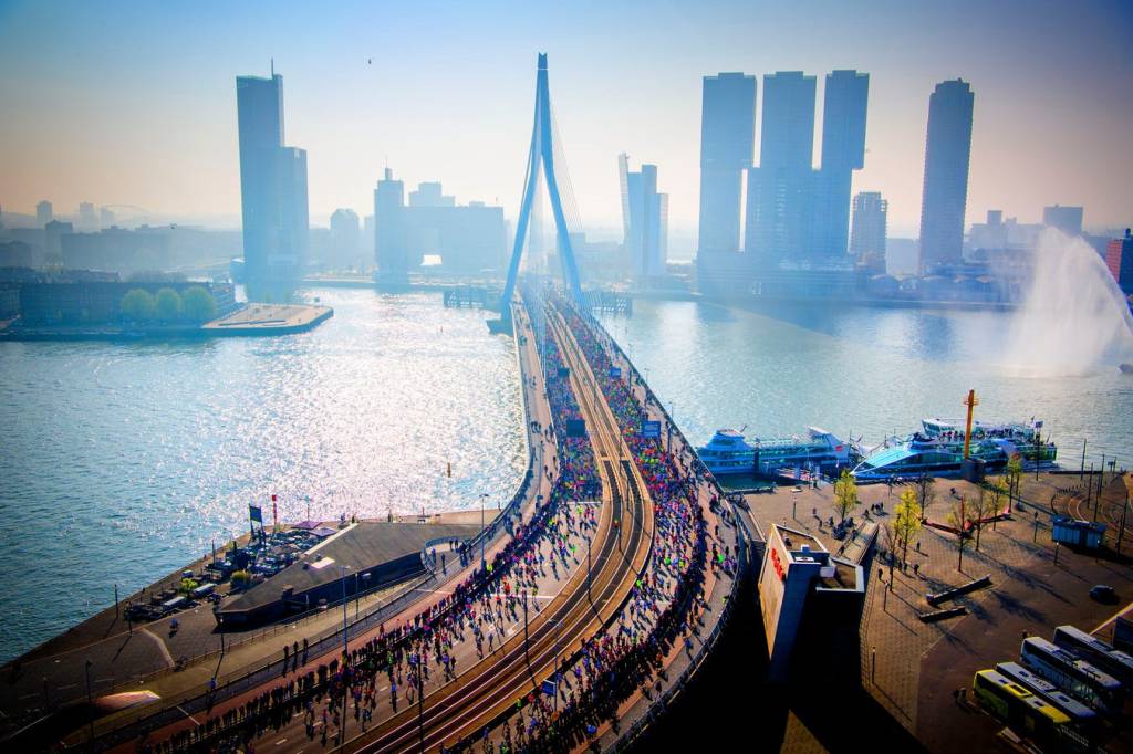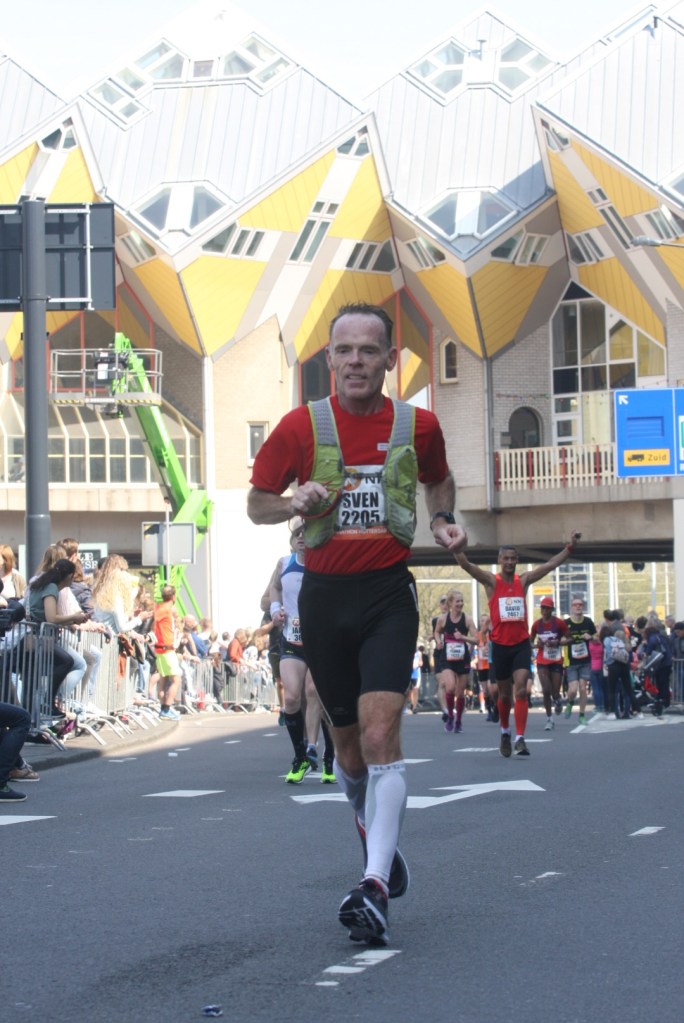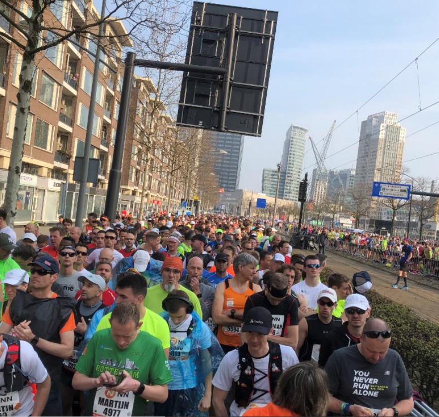 The start, at the entrance of the famous Erasmus Bridge, reminds me of the start of the NYC marathon where you also start on a bridge (Verrazano bridge). The cool thing about the start in Rotterdam is that famous Dutch singer Lee Towers sings his most famous song ‘You’ll never walk alone’, although they might wanna change that into “you’ll never pee alone” since this is typical 10 minutes before the start when lines for the toilets are endless as all the runners, male and female alike, try to squeeze out the last drops of nervousness 🙂