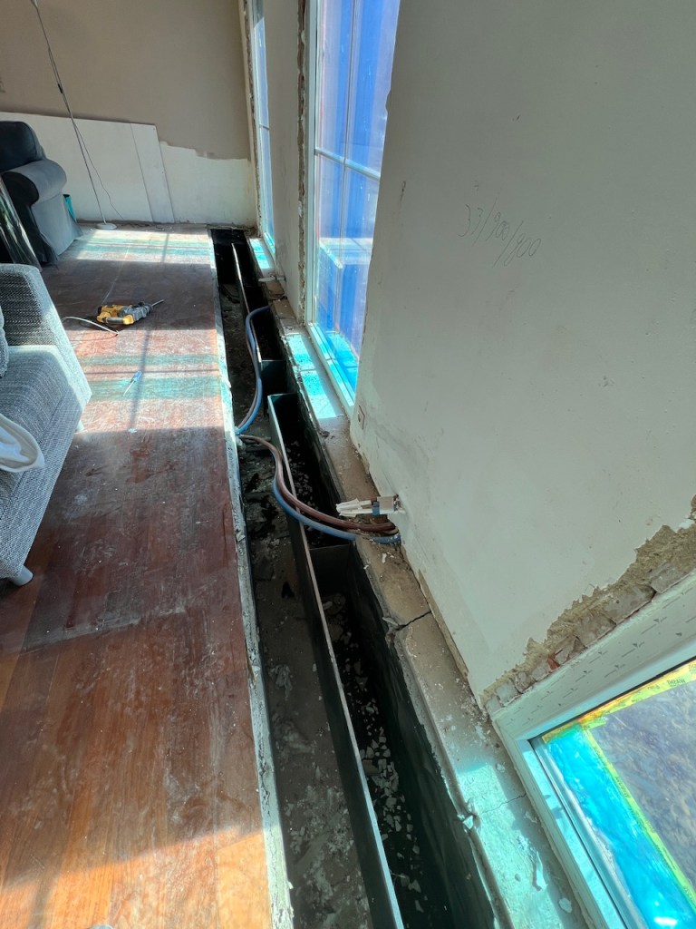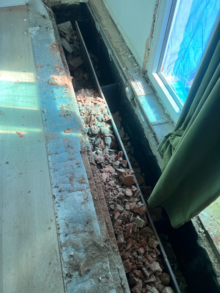 In all the rooms, we disconnected the old heating system so we can close these enormous large, ugly openings in the floor. The new radiators are not in yet, but since the house is now insulated, I can survive a few weeks without heating. And so we started filling up these large holes with building rubbish.