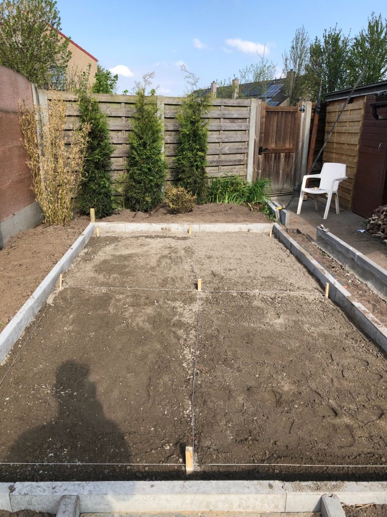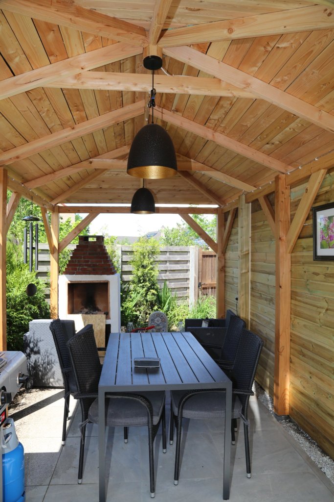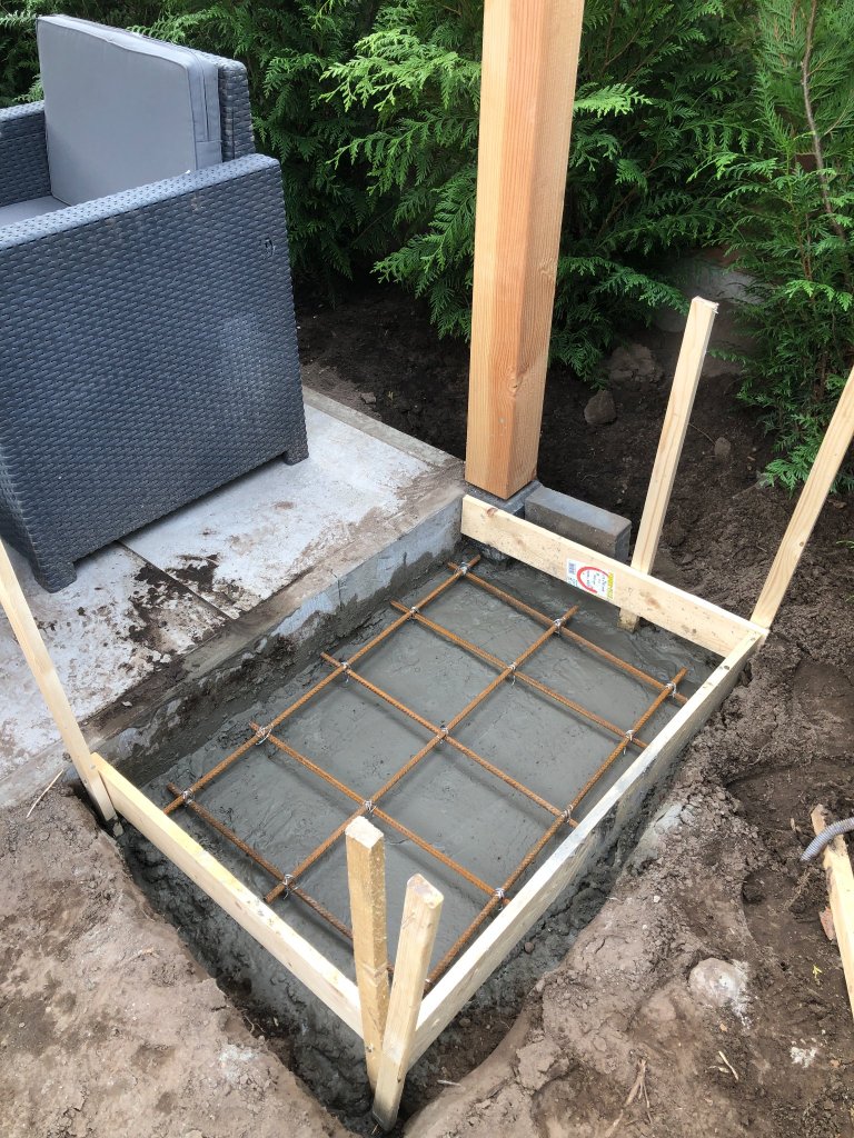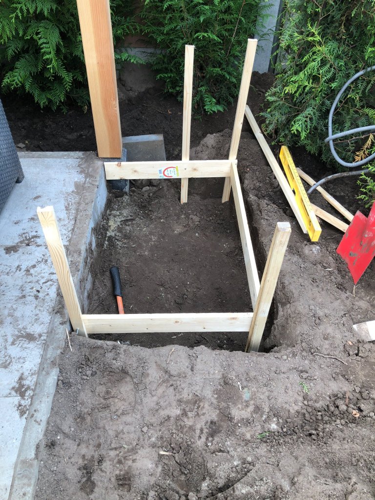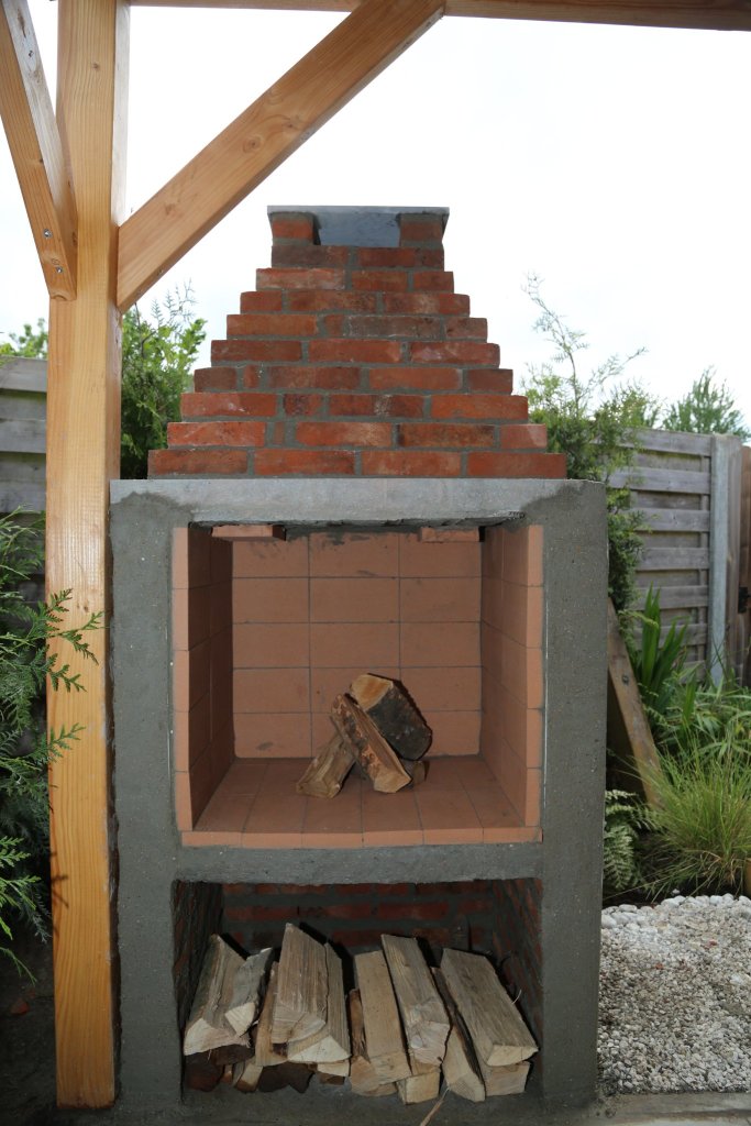 At the end of the garden I wanted to make a outdoor entertainment area including a tiled floor, a wooden structure big enough for a table and a grill, and I wanted to build a fire place.