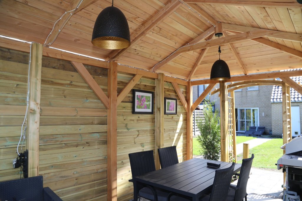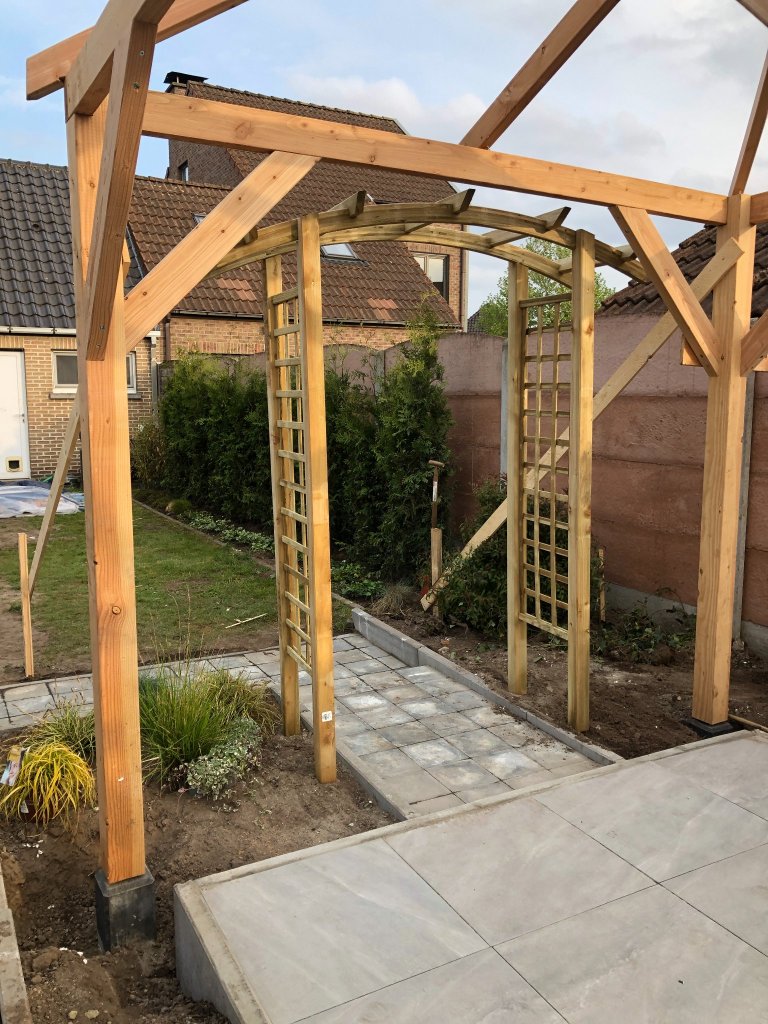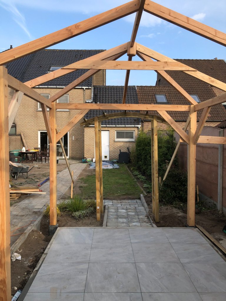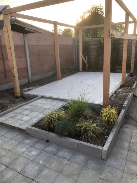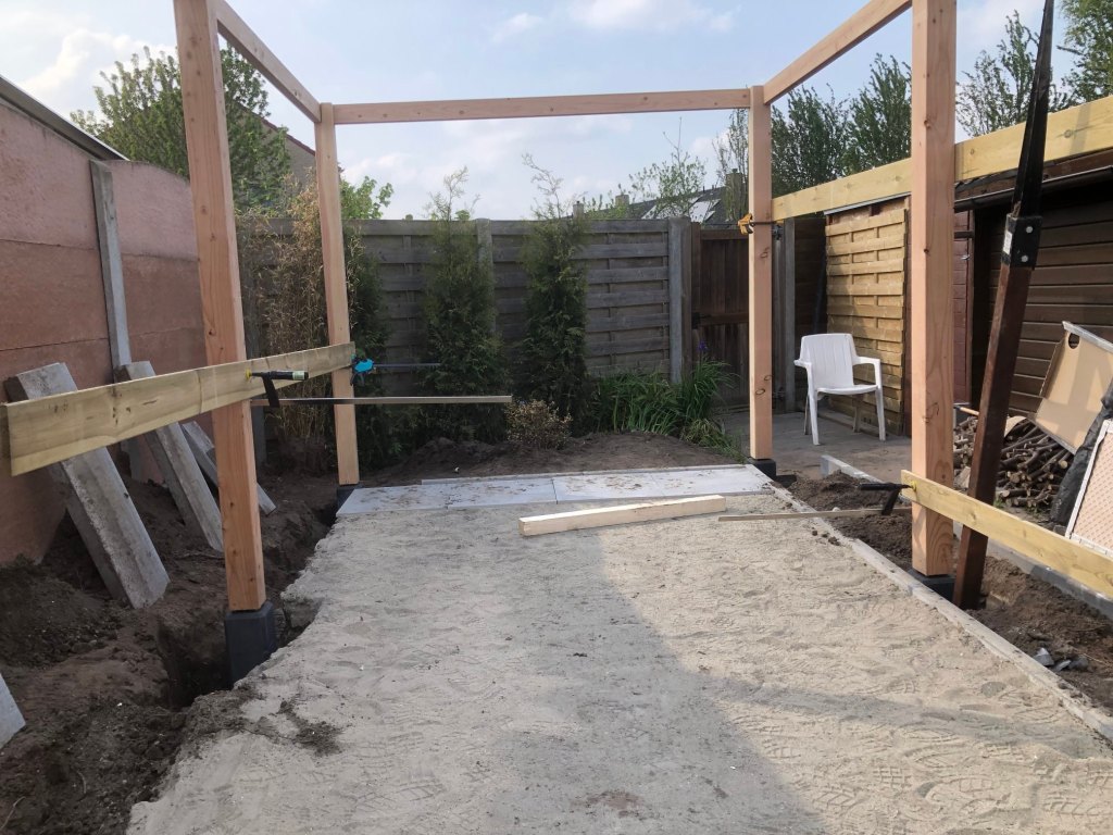 At the end of the garden I wanted to make a outdoor entertainment area including a tiled floor, a wooden structure big enough for a table and a grill, and I wanted to build a fire place.