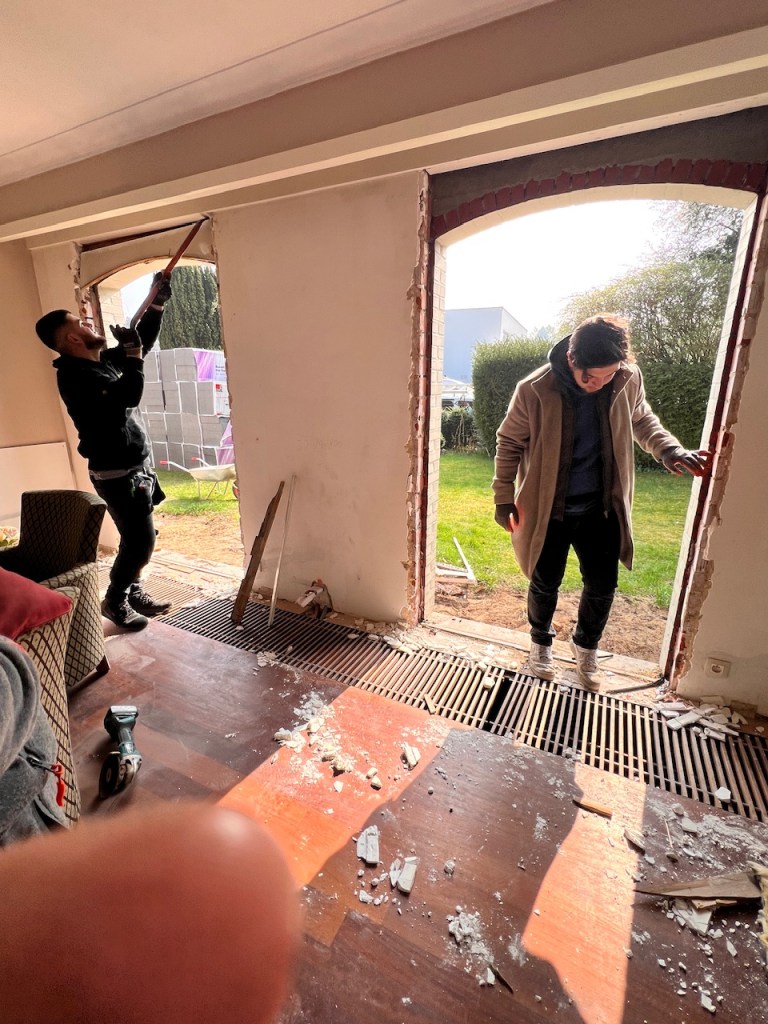 and as you can see, there are big openings in the floor covered by wooden grids. In these openings, there are heating elements, like radiators. This used to be popular and considered modern back in the 70’s when the house was build. I hate those things; first of all because you lose a lot space as you can’t put anything on top, second, because the look ugly, third: they collect a lot of dust. In other words: OUT. Because I took them out, we needed to add new water pipes and put regular radiators against the walls.